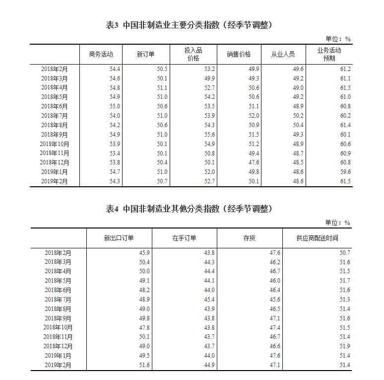 2019年2月份,中国非制造业商务活动指数为54.3%,比上月回落0.4个百分点,表明非制造业总体继续保持增长。