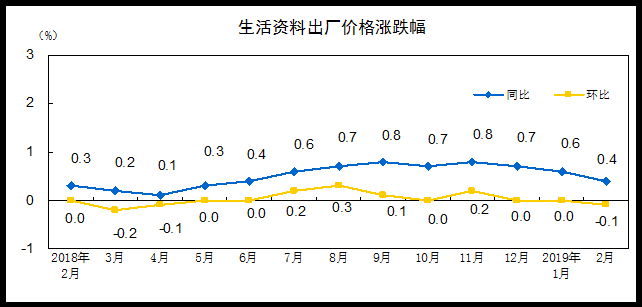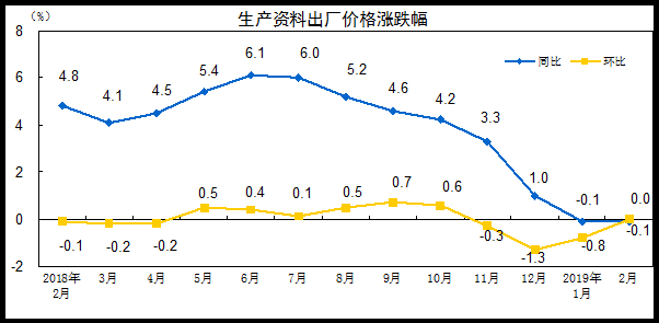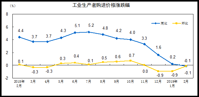 2019年2月份,全国工业生产者出厂价格同比上涨0.1%,环比下降0.1%;工业生产者购进价格同比和环比均下降0.1%。1—2月平均,工业生产者出厂价格和购进价格均比去年同期上涨0.1%。