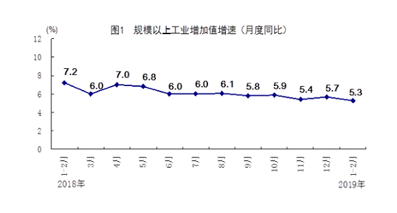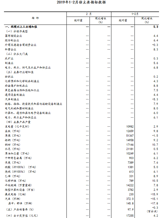 1-2月份,全国规模以上工业增加值同比增长5.3%,增速比上年12月份回落0.4个百分点。据测算,剔除春节因素,1-2月份全国规模以上工业增加值同比增长6.1%。从环比看,2月份全国规模以上工业增加值比上月增长0.43%。1-2月份,分经济类型看,国有控股企业增加值同比增长4.4%,股份制企业增长6.4%,外商及港澳台商投资企业下降0.3%。分三大门类看,采矿业增加值同比增长0.3%,制造业增长5.6%,电力、热力、燃气及水生产和供应业增长6.8%。战略性新兴产业增加值同比增长10.1%,增速快于全部规模以上工业4.8个百分点。新能源汽车产量同比增长53.3%,比上年12月份提高37.8个百分点;太阳能电池产量增长13.5%,提高0.4个百分点。1-2月份,发电量同比增长2.9%,2月份增长6.8%。2月份,制造业采购经理指数中新订单指数为50.6%,比上月上升1.0个百分点,市场预期出现向好趋势。