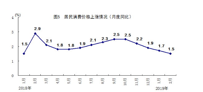 1-2月份,全国居民消费价格同比上涨1.6%,涨幅比上年12月份回落0.3个百分点。分类别看,食品烟酒价格同比上涨1.6%,衣着上涨1.8%,居住上涨2.1%,生活用品及服务上涨1.4%,交通和通信下降1.2%,教育文化和娱乐上涨2.6%,医疗保健上涨2.7%,其他用品和服务上涨2.1%。在食品烟酒价格中,粮食价格同比上涨0.5%,猪肉价格下降4.1%,鲜菜价格上涨2.6%。分月看,1、2月份全国居民消费价格同比分别上涨1.7%和1.5%,环比分别上涨0.5%和1.0%。