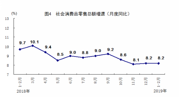 1-2月份,社会消费品零售总额66064亿元,同比增长8.2%,增速与上年12月份持平。按经营单位所在地分,城镇消费品零售额56210亿元,同比增长8.0%;乡村消费品零售额9854亿元,增长9.1%。按消费类型分,餐饮收入7251亿元,增长9.7%;商品零售58813亿元,增长8.0%。升级类商品消费增速较快。1-2月份,限额以上单位商品零售额中,书报杂志类、化妆品类、文化办公用品类同比分别增长33.9%、8.9%和8.8%,增速分别比社会消费品零售总额快25.7、0.7和0.6个百分点。1-2月份,全国网上零售额13983亿元,同比增长13.6%。其中,实物商品网上零售额10901亿元,增长19.5%,占社会消费品零售总额的比重为16.5%,比上年同期提高1.6个百分点。从环比看,2月份社会消费品零售总额比上月增长0.81%。