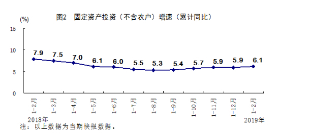 1-2月份,全国固定资产投资(不含农户)44849亿元,同比增长6.1%,增速比上年全年加快0.2个百分点。其中,民间投资26963亿元,增长7.5%。分产业看,第一产业投资同比增长3.7%;第二产业投资增长5.5%,其中制造业投资增长5.9%;第三产业投资增长6.5%,增速比上年全年加快1.0个百分点,其中基础设施投资增长4.3%。高技术产业投资、工业技术改造投资同比分别增长8.6%和19.5%,增速分别快于全部投资2.5和13.4个百分点。1-2月份,全国房地产开发投资12090亿元,同比增长11.6%;全国商品房销售面积14102万平方米,下降3.6%;全国商品房销售额12803亿元,增长2.8%。从环比看,2月份固定资产投资比上月增长0.43%。