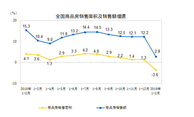 1-2月份,商品房销售面积14102万平方米,同比下降3.6%,2018年全年为增长1.3%。其中,住宅销售面积下降3.2%,办公楼销售面积下降15.7%,商业营业用房销售面积下降13.6%。商品房销售额12803亿元,增长2.8%,增速回落9.4个百分点。其中,住宅销售额增长4.5%,办公楼销售额下降6.2%,商业营业用房销售额下降9.4%。