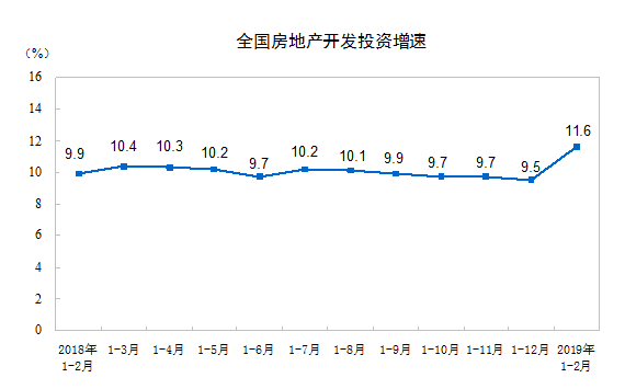 2019年1-2月份,全国房地产开发投资12090亿元,同比增长11.6%,增速比2018年全年提高2.1个百分点。其中,住宅投资8711亿元,增长18.0%,增速提高4.6个百分点。住宅投资占房地产开发投资的比重为72.1%。