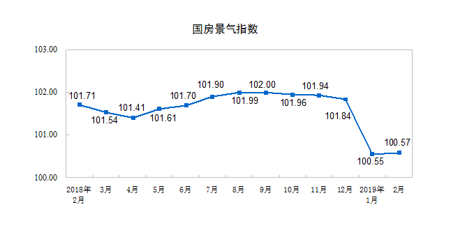 2月份,房地产开发景气指数(简称“国房景气指数”)为100.57,比2018年12月份回落1.27点。