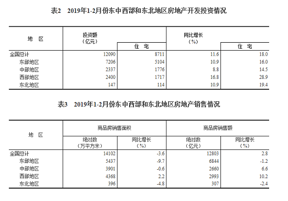 1-2月份,东部地区房地产开发投资7206亿元,同比增长10.9%,增速与2018年全年持平;中部地区投资2337亿元,增长8.8%,增速提高3.4个百分点;西部地区投资2400亿元,增长16.8%,增速提高7.9个百分点;东北地区投资147亿元,增长10.9%,增速回落6.6个百分点。