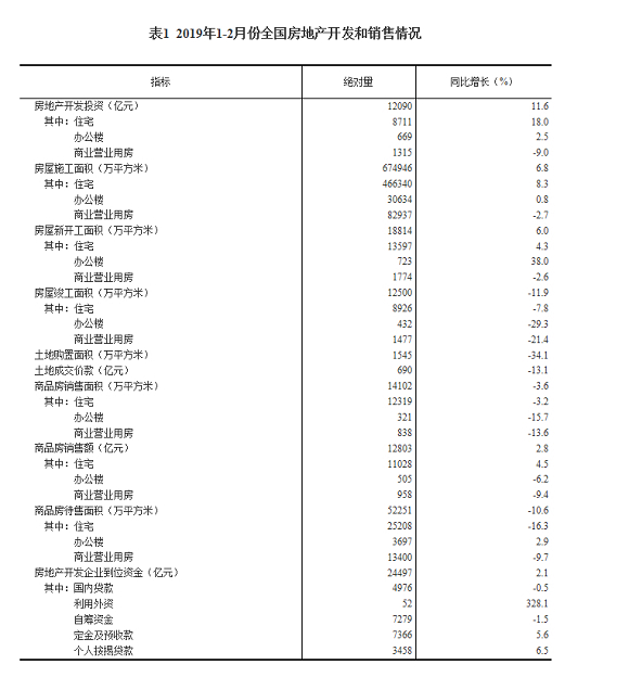 2019年1-2月份全国房地产开发投资和销售情况