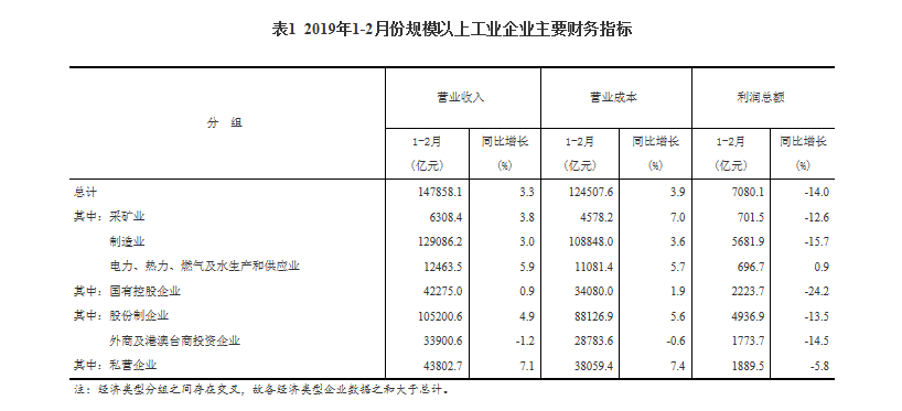 统计局:1-2月规模以上工业企业利润同比下降14%