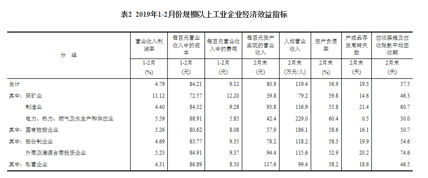 2月末,规模以上工业企业每百元资产实现的营业收入为80.9元,同比减少2.4元;人均营业收入为119.4万元,同比增加7.6万元;产成品存货周转天数为19.3天,同比增加0.4天;应收票据及应收账款平均回收期为57.5天,同比增加4.6天。