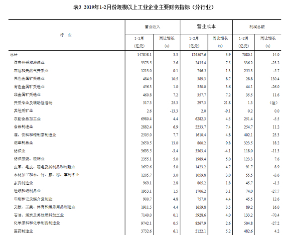 1-2月份,规模以上工业企业实现营业收入14.8万亿元,同比增长3.3%;发生营业成本12.5万亿元,增长3.9%;营业收入利润率为4.79%,同比降低0.96个百分点。