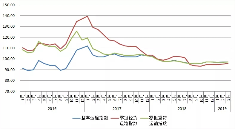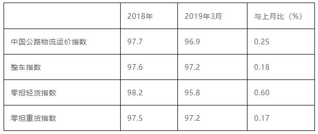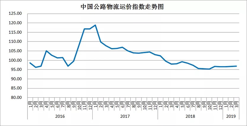2019年3月份,由中国物流与采购联合会和林安物流集团联合调查的中国公路物流运价指数为96.9点,环比回升0.25%,连续两个月小幅回升。