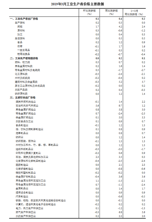 2019年3月份,全国工业生产者出厂价格同比上涨0.4%,环比上涨0.1%;工业生产者购进价格同比上涨0.2%,环比持平。一季度,工业生产者出厂价格比去年同期上涨0.2%,工业生产者购进价格上涨0.1%。
