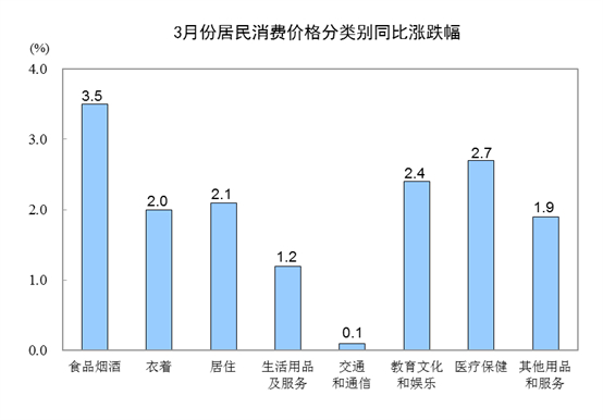 从同比看,CPI上涨2.3%,涨幅比上月扩大0.8个百分点。其中,食品价格上涨4.1%,影响CPI上涨约0.82个百分点;非食品价格上涨1.8%,影响CPI上涨约1.46个百分点。在食品中,春季是蔬菜上市的淡季,加之受多地低温阴雨天气影响,鲜菜价格上涨较快,同比上涨16.2%,影响CPI上涨约0.42个百分点;猪肉价格上涨5.1%,为同比连降25个月后首次转涨,影响CPI上涨约0.12个百分点。在非食品中,医疗保健、教育文化和娱乐、居住价格分别上涨2.7%、2.4%和2.1%,合计影响CPI上涨约0.94个百分点。据测算,在3月份2.3%的同比涨幅中,去年价格变动的翘尾影响约为1.1个百分点,新涨价影响约为1.2个百分点。
