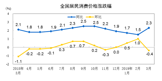 2019年3月份,全国居民消费价格同比上涨2.3%。其中,城市上涨2.3%,农村上涨2.3%;食品价格上涨4.1%,非食品价格上涨1.8%;消费品价格上涨2.4%,服务价格上涨2.0%。一季度,全国居民消费价格总水平比去年同期上涨1.8%。