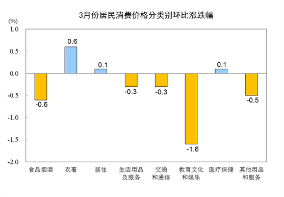 3月份,全国居民消费价格环比下降0.4%。其中,城市下降0.4%,农村下降0.3%;食品价格下降0.9%,非食品价格下降0.2%;消费品价格下降0.1%,服务价格下降0.8%。