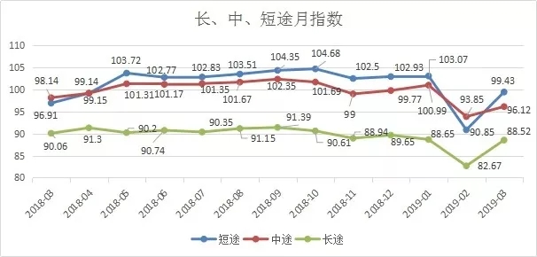 【长、中、短途月指数】3月份,长途月指数为88.52;中途的月指数为96.12;短途的月指数为99.43。与上一月份相比,长途月指数上升了5.85;中途月指数上升了2.27;短途月指数上升了8.58。