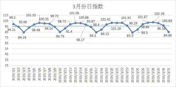 【行业总体日指数】从日指数变化来看,3月份指数呈4个完整周期和1个不完整周期。指数最低值是3月24日的83.9;指数最高值是3月28日的102.39。 全月有10天的指数水平达到基准数(100)以上,比上个月多9天;从趋势线上看,从月初到月末呈明显的稳定趋势。