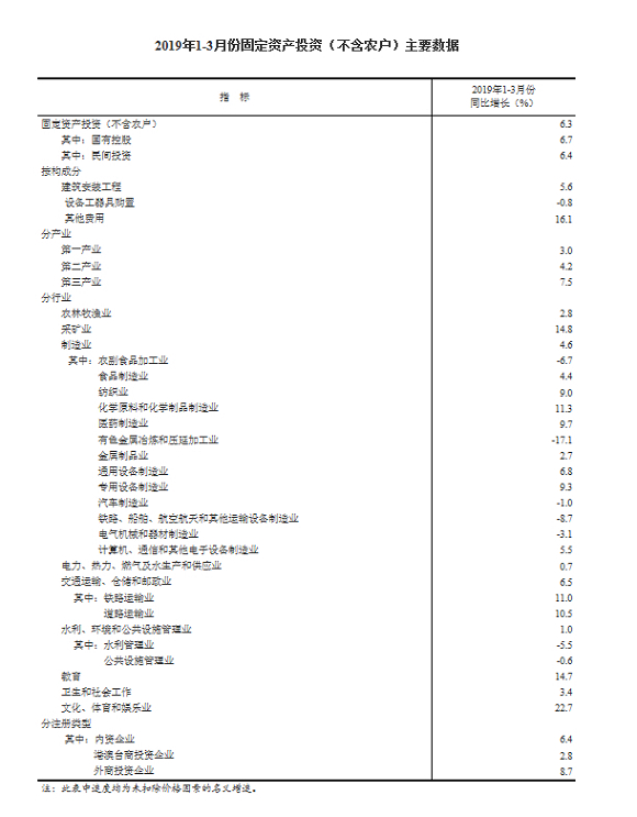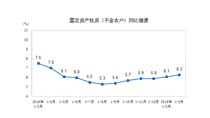 2019年1-3月份,全国固定资产投资(不含农户)101871亿元,同比增长6.3%,增速比1-2月份加快0.2个百分点。从环比速度看,3月份固定资产投资(不含农户)增长0.45%。其中,民间固定资产投资61492亿元,同比增长6.4%,增速比1-2月份回落1.1个百分点。
