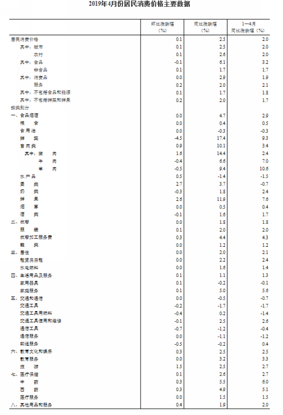 2019年4月份,全国居民消费价格同比上涨2.5%。其中,城市上涨2.5%,农村上涨2.6%;食品价格上涨6.1%,非食品价格上涨1.7%;消费品价格上涨2.9%,服务价格上涨2.0%。