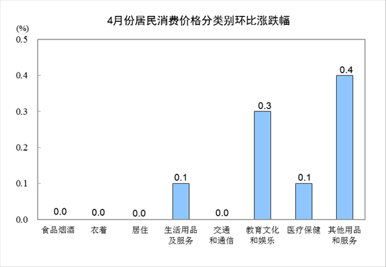 4月份,全国居民消费价格环比上涨0.1%。其中,城市和农村均上涨0.1%;食品价格下降0.1%,非食品价格上涨0.1%;消费品价格与上月持平,服务价格上涨0.2%。