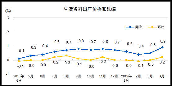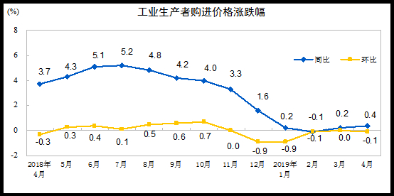 2019年4月份,全国工业生产者出厂价格同比上涨0.9%,环比上涨0.3%;工业生产者购进价格同比上涨0.4%,环比下降0.1%。1—4月平均,工业生产者出厂价格比去年同期上涨0.3%,工业生产者购进价格上涨0.2%。