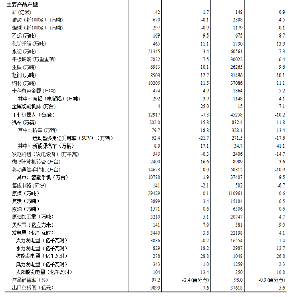 分产品看,4月份,605种产品中有298种产品同比增长。其中,钢材10205万吨,同比增长11.5%;水泥21345万吨,增长3.4%;十种有色金属474万吨,增长4.9%;乙烯169万吨,增长9.5%;汽车202.0万辆,下降15.8%,其中,轿车79.7万辆,下降18.8%;新能源汽车8.9万辆,增长17.1%;发电量5440亿千瓦时,增长3.8%;原油加工量5210万吨,增长5.1%。