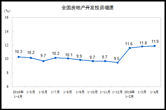 2019年1—4月份,全国房地产开发投资34217亿元,同比增长11.9%,增速比1—3月份提高0.1个百分点。其中,住宅投资24925亿元,增长16.8%,增速回落0.5个百分点。住宅投资占房地产开发投资的比重为72.8%。