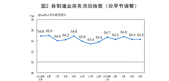 2019年5月份,中国非制造业商务活动指数为54.3%,与上月持平,表明非制造业总体延续平稳较快的发展势头。