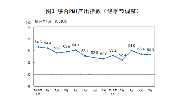 2019年5月份,综合PMI产出指数为53.3%,比上月微落0.1个百分点,表明我国企业生产经营活动总体保持平稳发展态势。