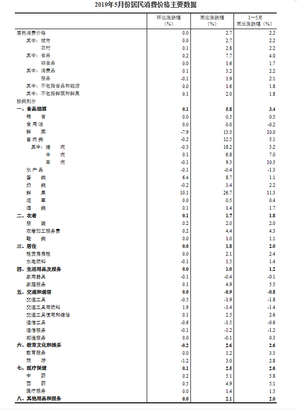 2019年5月份,全国居民消费价格同比上涨2.7%。其中,城市上涨2.7%,农村上涨2.8%;食品价格上涨7.7%,非食品价格上涨1.6%;消费品价格上涨3.2%,服务价格上涨1.9%。1-5月平均,全国居民消费价格比去年同期上涨2.2%。