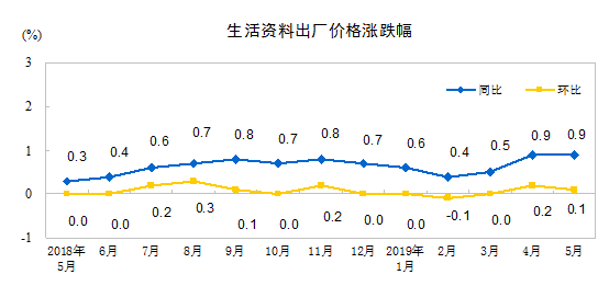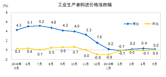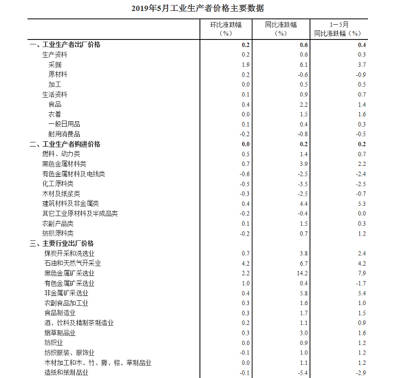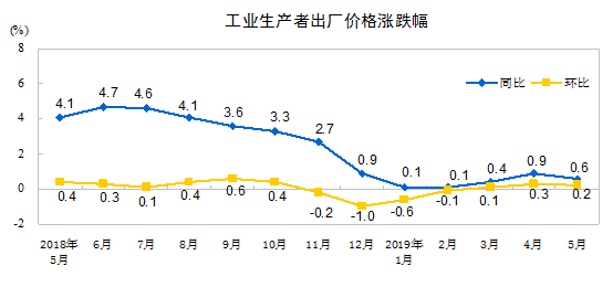2019年5月份,全国工业生产者出厂价格同比上涨0.6%,环比上涨0.2%;工业生产者购进价格同比上涨0.2%,环比持平。1—5月平均,工业生产者出厂价格比去年同期上涨0.4%,工业生产者购进价格上涨0.2%。