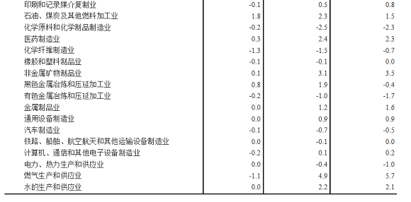 工业生产者出厂价格中,生产资料价格同比上涨0.6%,涨幅比上月回落0.3个百分点,影响工业生产者出厂价格总水平上涨约0.41个百分点。其中,采掘工业价格上涨6.1%,原材料工业价格下降0.6%,加工工业价格上涨0.5%。生活资料价格同比上涨0.9%,涨幅与上月相同,影响工业生产者出厂价格总水平上涨约0.23个百分点。其中,食品价格上涨2.2%,衣着价格上涨1.5%,一般日用品价格上涨0.4%,耐用消费品价格下降0.8%。