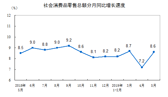 2019年5月份,社会消费品零售总额32956亿元,同比名义增长8.6%(扣除价格因素实际增长6.4%,以下除特殊说明外均为名义增长)。其中,限额以上单位消费品零售额11694亿元,增长5.1%。