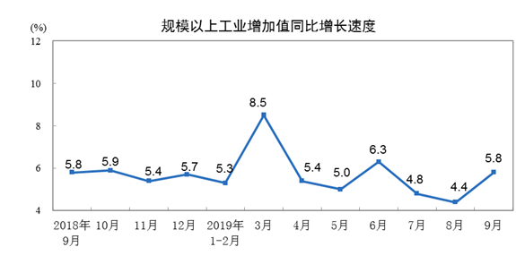 2019年9月份,规模以上工业增加值同比实际增长5.8%(以下增加值增速均为扣除价格因素的实际增长率),比8月份加快1.4个百分点。从环比看,9月份,规模以上工业增加值比上月增长0.72%。1—9月份,规模以上工业增加值同比增长5.6%。