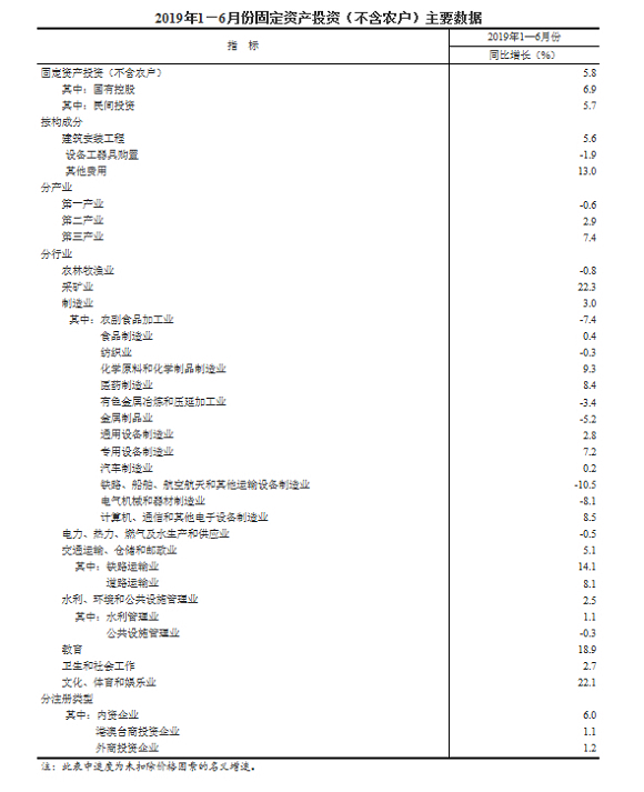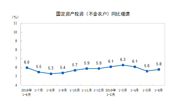 2019年1—6月份全国固定资产投资(不含农户)增长5.8%
