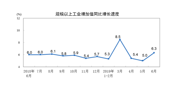 2019年6月份,规模以上工业增加值同比实际增长6.3%(以下增加值增速均为扣除价格因素的实际增长率),比5月份加快1.3个百分点。从环比看,6月份,规模以上工业增加值比上月增长0.68%。1-6月份,规模以上工业增加值同比增长6.0%。