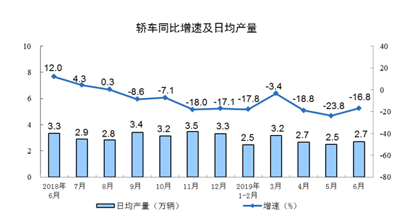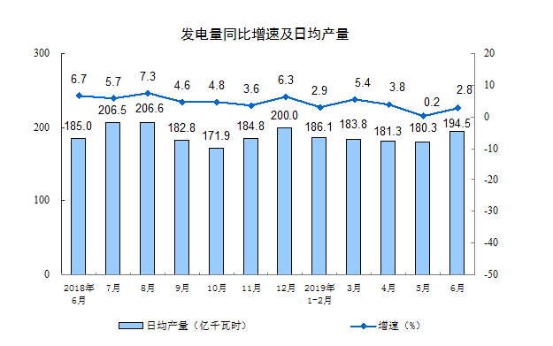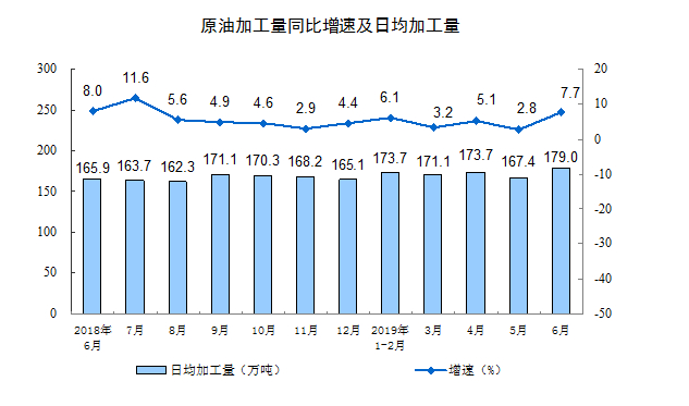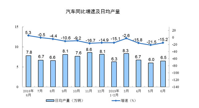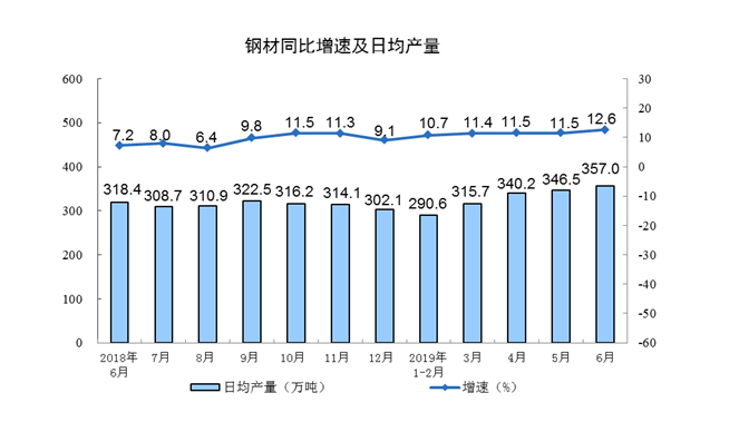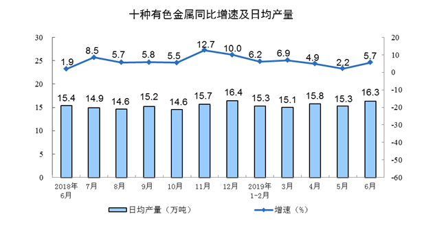 分行业看,6月份,41个大类行业中有36个行业增加值保持同比增长。其中,农副食品加工业增长2.5%,纺织业增长1.6%,化学原料和化学制品制造业增长5.4%,非金属矿物制品业增长9.5%,黑色金属冶炼和压延加工业增长13.7%,有色金属冶炼和压延加工业增长12.9%,通用设备制造业增长2.6%,专用设备制造业增长5.3%,汽车制造业下降2.5%,铁路、船舶、航空航天和其他运输设备制造业增长14.5%,电气机械和器材制造业增长11.3%,计算机、通信和其他电子设备制造业增长10.4%,电力、热力生产和供应业增长5.6%。