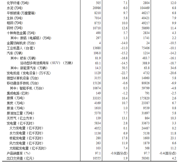 分产品看,6月份,605种产品中有339种产品同比增长。其中,钢材10710万吨,同比增长12.6%;水泥20986万吨,增长6.0%;十种有色金属490万吨,增长5.7%;乙烯166万吨,增长11.9%;新能源汽车14.3万辆,增长50.5%;发电量5834亿千瓦时,增长2.8%;原油加工量5370万吨,增长7.7%。