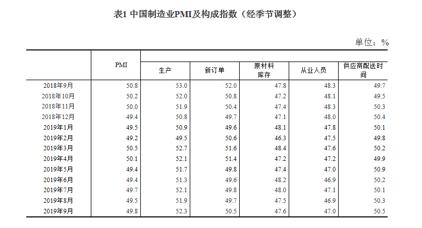 2019年9月份,中国制造业采购经理指数(PMI)为49.8%,比上月回升0.3个百分点。