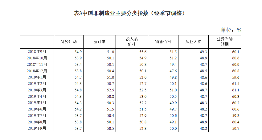 2019年9月份,非制造业商务活动指数为53.7%,略低于上月0.1个百分点,非制造业总体延续平稳扩张态势。