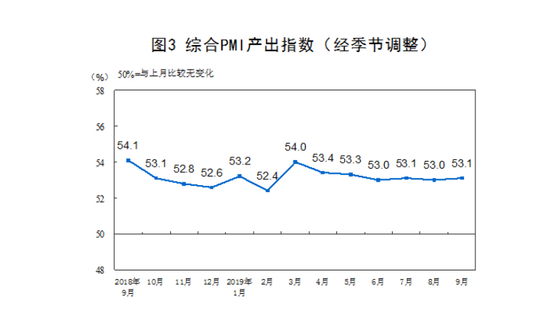 2019年9月份,综合PMI产出指数为53.1%,略高于上月0.1个百分点,表明我国企业生产运营总体平稳。