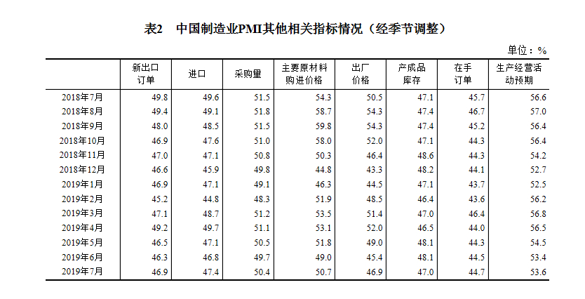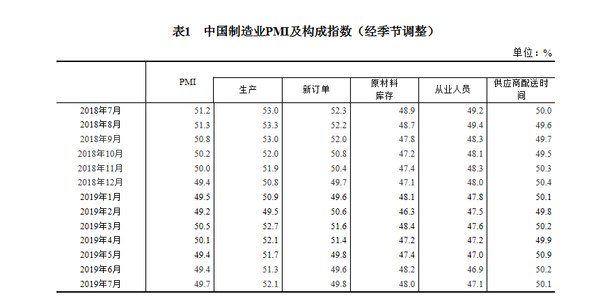 2019年7月份,中国制造业采购经理指数(PMI)为49.7%,比上月提高0.3个百分点,制造业景气水平有所回升。