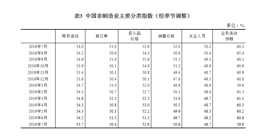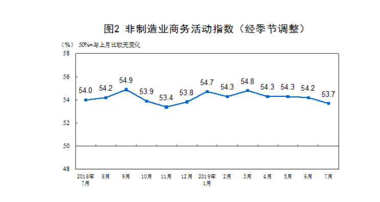 2019年7月份,中国非制造业商务活动指数为53.7%,比上月回落0.5个百分点,位于扩张区间。