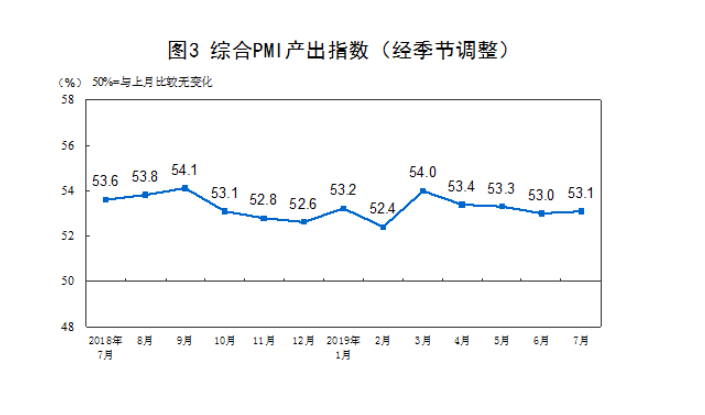 2019年7月份,综合PMI产出指数为53.1%,比上月微升0.1个百分点,表明我国企业生产经营活动稳步扩张。