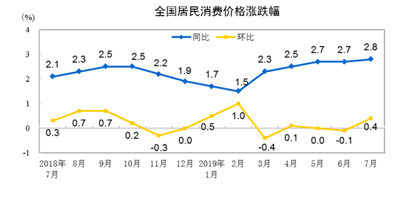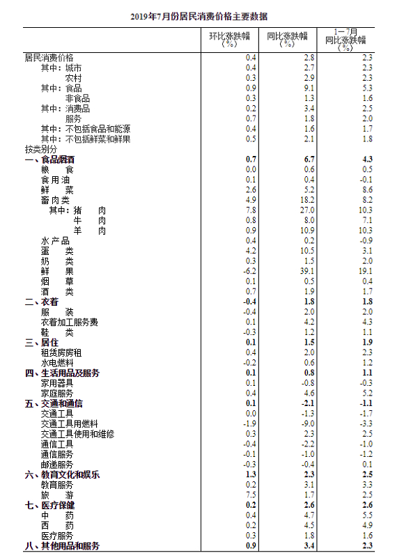 2019年7月份,全国居民消费价格同比上涨2.8%。其中,城市上涨2.7%,农村上涨2.9%;食品价格上涨9.1%,非食品价格上涨1.3%;消费品价格上涨3.4%,服务价格上涨1.8%。1--—7月平均,全国居民消费价格比去年同期上涨2.3%。