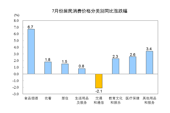 从同比看,CPI上涨2.8%,涨幅比上月扩大0.1个百分点。其中,食品价格上涨9.1%,涨幅比上月扩大0.8个百分点,影响CPI上涨约1.74个百分点;非食品价格上涨1.3%,涨幅比上月回落0.1个百分点,影响CPI上涨约1.04个百分点。在食品中,鲜果价格上涨39.1%,涨幅比上月回落3.6个百分点;猪肉价格上涨27.0%,涨幅扩大5.9个百分点。上述两项合计影响CPI上涨约1.22个百分点。鸡蛋、鸡肉、牛肉、羊肉和鲜菜价格涨幅在5.2%至11.4%之间。在非食品中,医疗保健、教育文化和娱乐、居住价格分别上涨2.6%、2.3%和1.5%,合计影响CPI上涨约0.80个百分点。据测算,在7月份2.8%的同比涨幅中,去年价格变动的翘尾影响约为1.2个百分点,新涨价影响约为1.6个百分点。