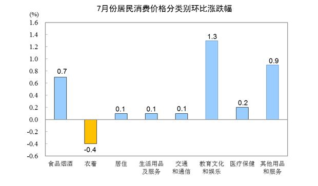 7月份,全国居民消费价格环比上涨0.4%。其中,城市上涨0.4%,农村上涨0.3%;食品价格上涨0.9%,非食品价格上涨0.3%;消费品价格上涨0.2%,服务价格上涨0.7%。