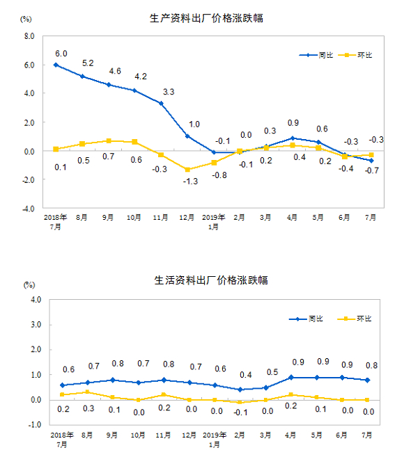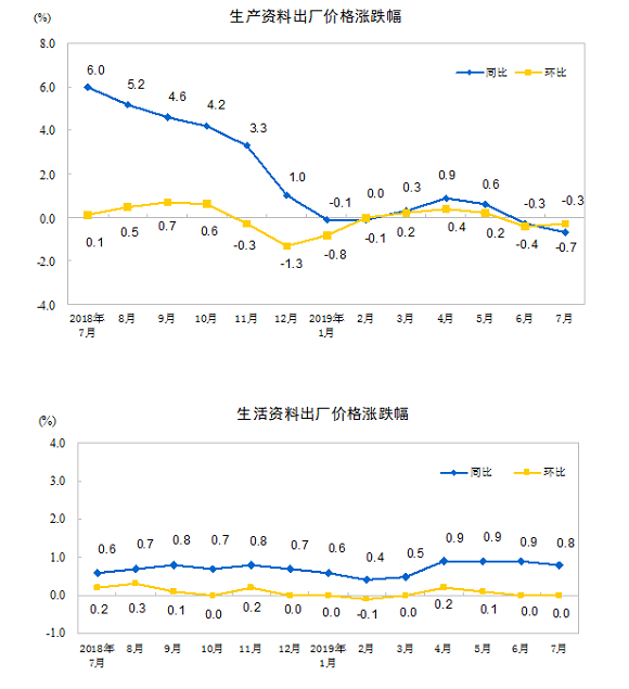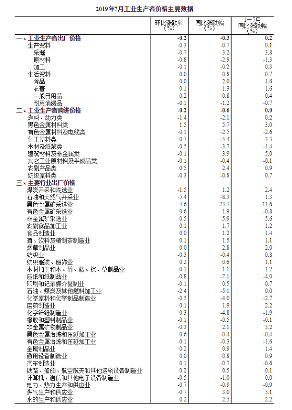 2019年7月份,全国工业生产者出厂价格同比下降0.3%,环比下降0.2%;工业生产者购进价格同比下降0.6%,环比下降0.2%。1—7月平均,工业生产者出厂价格比去年同期上涨0.2%,工业生产者购进价格持平。