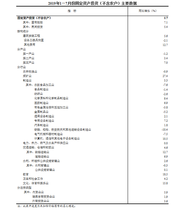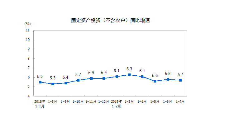 2019年1—7月份,全国固定资产投资(不含农户)348892亿元,同比增长5.7%,增速比1—6月份回落0.1个百分点。从环比速度看,7月份固定资产投资(不含农户)增长0.43%。其中,民间固定资产投资210267亿元,同比增长5.4%,增速比1—6月份回落0.3个百分点。