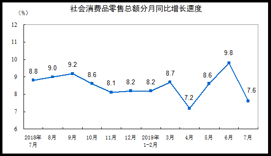 2019年1-7月份,社会消费品零售总额228283亿元,同比增长8.3%。其中,除汽车以外的消费品零售额206136亿元,增长9.2%。